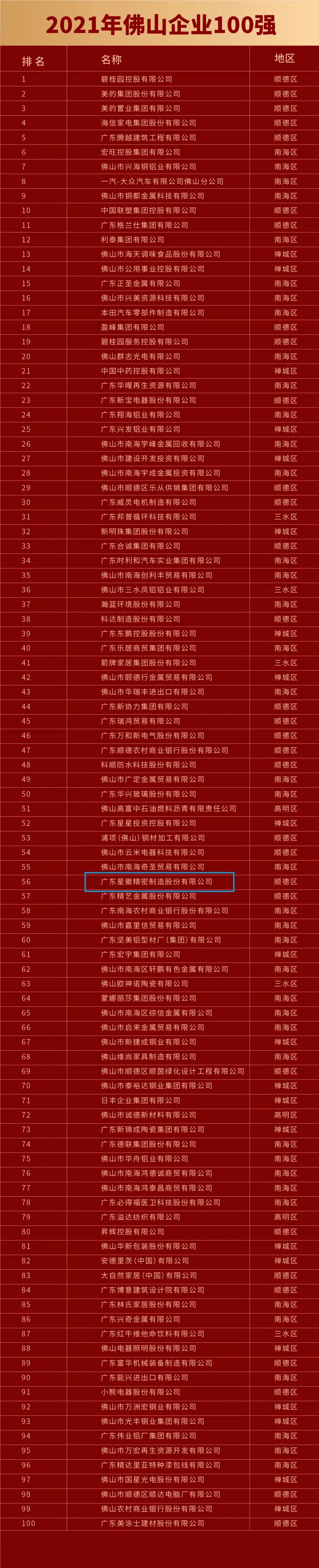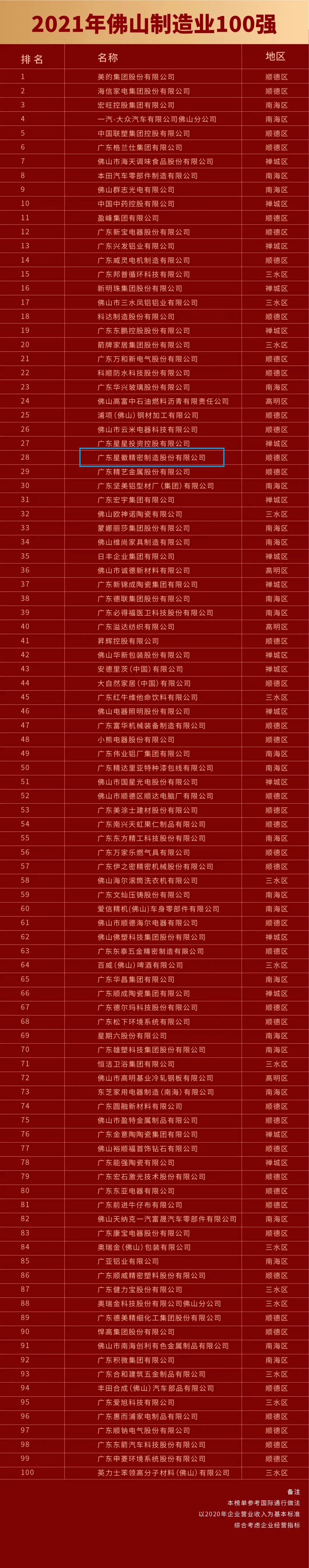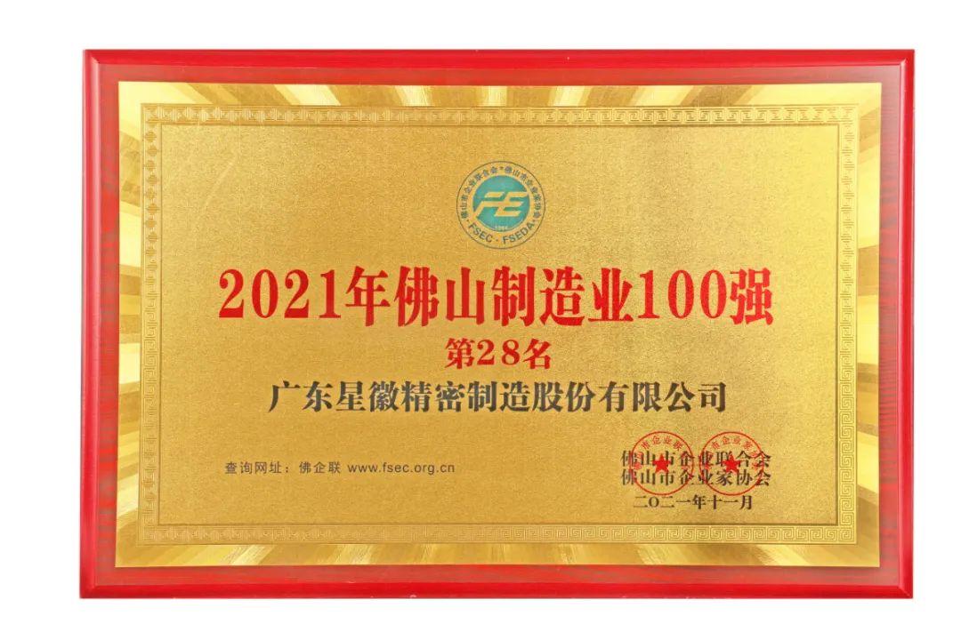 2021年11月20日,由佛山市企業(yè)聯(lián)合會、佛山市企業(yè)家協(xié)會主辦的2021年佛山市企業(yè)家活動日暨佛山企業(yè)100強(qiáng)、制造業(yè)100強(qiáng)企業(yè)發(fā)布會順利舉行。會上發(fā)布了佛山雙百強(qiáng)榜單,憑借強(qiáng)勁的綜合實力和品牌影響力,星徽精密榮登“2021年佛山企業(yè)100強(qiáng)“第56名、“2021年佛山制造業(yè)100強(qiáng)”第28名,在家居五金企業(yè)中排名位列第一。